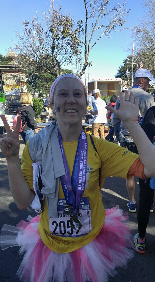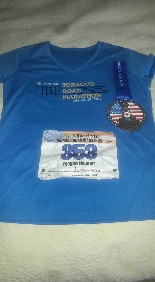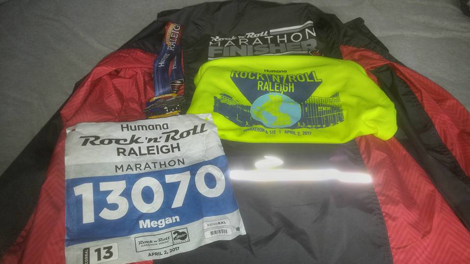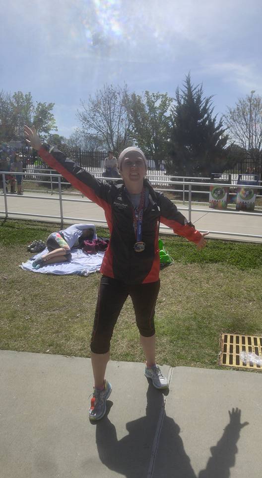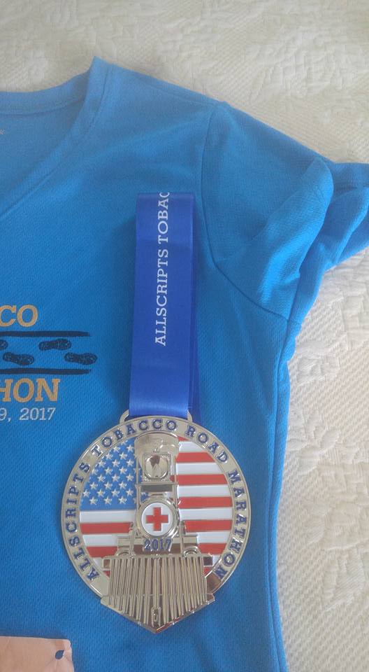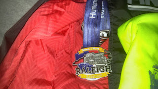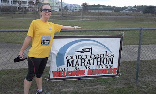 From this point on, enjoy a random collection of memories. I spent some time near a group of two girls and one guy. They had some sort of music/movie trivia game going on. I piped up and said that I didn't have any trivia, but would they mind an amusing anecdote? They invited me to participate at some point, but my brain was mush. I also remember the family with their young kids. It's really cool to see the same locals, year after year. A lot of things, like the family, stay the same. The water stop by the schools seems to be where I always take my Tylenol (2 before, 2 at about 8:30 a.m.). I'm pretty sure I dropped the Tylenol...that always happens. I didn't carry liquid since I could get it every other mile. I did take Snickers, but didn't eat much of it. It just seemed to much work to get it out. There was a sponsor table heading into the woods. I think I got an orange wedge. Speaking of the woods, they're HARD. Some people hate them. Personally, I think it's a good idea to run through there when you're spending so many miles on the pavement. Knees really need a break. Speaking of knees, I ALWAYS wear a support on both after my first marathon (horrible pain for most of it). I made conversation with random people. One person I didn't talk to, a spectator, actually, had a sign that said, ''I thought you said rum.'' I saw her several times that weekend and was getting tired of being taunted. ;) There was a table with soda, pickle juice and maybe some salty snacks. She didn't have any drinks besides the soda and asked me if I wanted the pickle juice (the salt helps with cramps). I actually felt okay, but I told her I wasn't that desperate. I might have gotten some pretzels from her table. My knees did well, but my lower back got irritated some. I slathered on biofreeze several times. I might have put it on my knees, too, but I can't quite recall. Long distance races are a funny thing. You start with so many people and lots of energy. You reach the point where people are so spaced out and you can see everyone struggling. I always wonder how I'm going to get through it. Five plus hours doing one thing is a long time. The miles always pass by so much faster than I think they will in the beginning. Before I knew it, I was back out of the woods and running towards/through Nags Head. Eventually, we see the sign where we'll turn towards the bridge. Of course, the sign and turn seem so far off. Even when you make the actual turn, you're not on the bridge right away. I think we turned onto the bridge road between miles 20 and 21. The worst part of the bridge is that terrible incline. If you've ever run it, you know what I mean. I tried to keep my head down so that I couldn't see it. I didn't want the sight of it to be my downfall. After years of running it, I finally managed to run up the whole thing; I wanted to be able to do that again. I looked up a few times, but always put my head back down. After that incline, you get the joy of going down. I asked a few guys (at some point on the bridge) if they were going to let an ''old lady'' pass them. They were about 10 years younger. Not too long after the peak, we turn at a CVS. I think any runner will tell you that it's one of the best things they've ever seen. At this point, there were still a few miles left, but not that many turns. It's just one foot in front of the other. My phone had died, so I had no run/walk timer to depend on. I just did whatever felt good. Eventually, I made it to the last few turns. I've done it so many times that I knew how many turns lay ahead. The home stretch of a marathon is like nothing else. You've been working hard for months and pushing yourself for hours. Then, you have all these random strangers cheering you on. I think I just tried to keep it steady until I got close enough to really go. FINISH! I collected my three medals, my food and headed for the bush. My knees were still okay, but my feet were pretty sensitive.